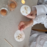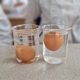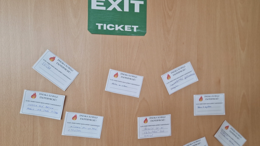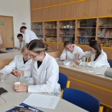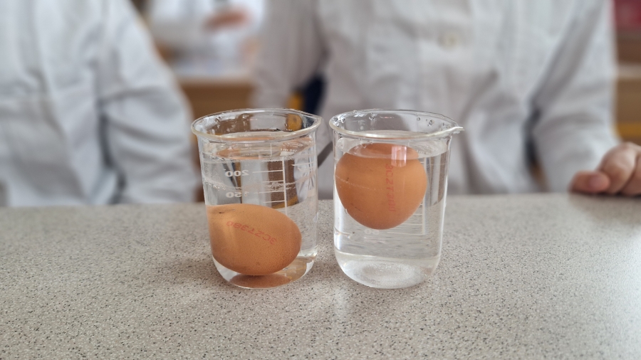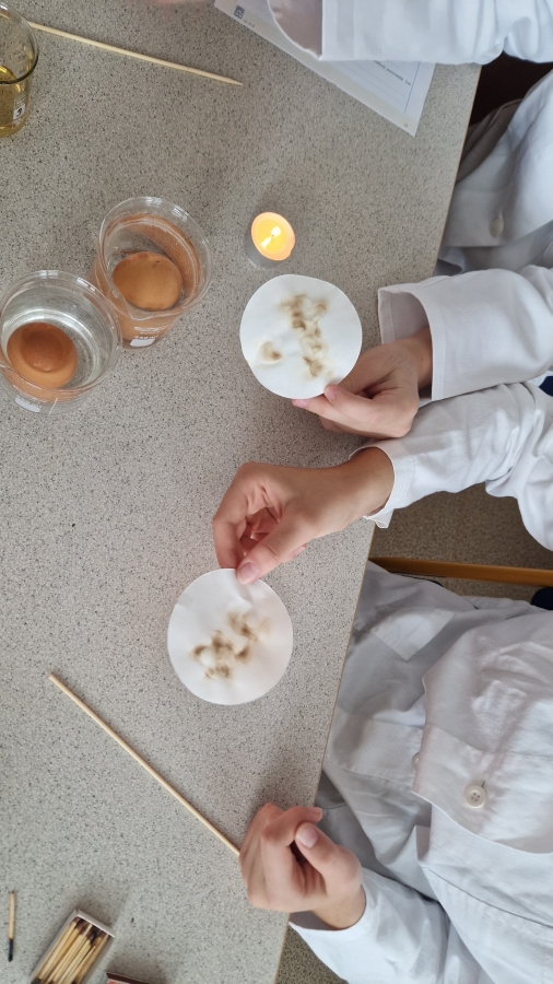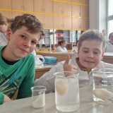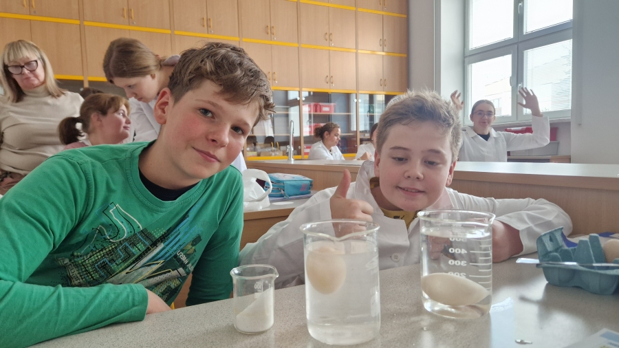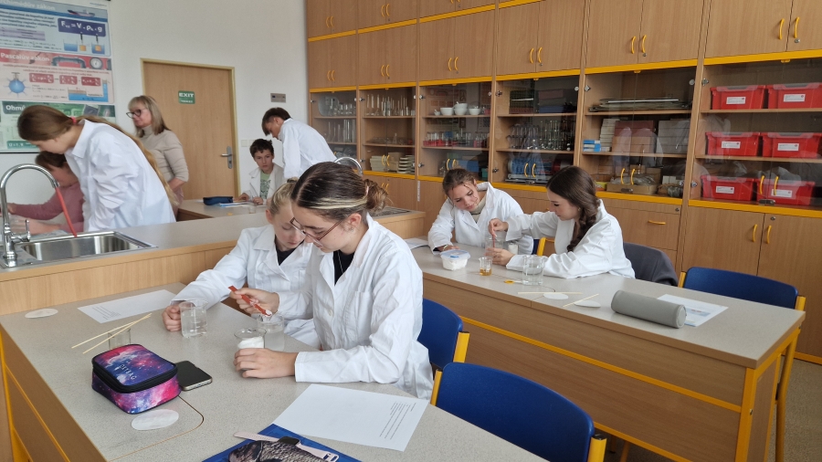 V první laboratorní práci v 8. třídě žáci zkoumali chování vejce ve vodě a slaném roztoku. Nejprve sledovali, jak se vejce ve vodě okamžitě potápí. Ale jakmile přidali sůl a vytvořili nasycený roztok, vejce začalo volně plavat, jako by bylo nadnášeno. V druhé části je pak čekal další experiment – tentokrát tajné písmo. Pomocí octu a filtračního papíru žáci vytvářeli tajné vzkazy, které byly zpočátku neviditelné. Po zahřátí papíru se však skryté zprávy objevily. Až na pár vzplanutí si všichni mohli přečíst tajný vzkaz. Na závěr hodiny každý žák obdržel exitku, kde mohl vyjádřit své dojmy z první laboratorní práce. Všichni žáci pracovali skvěle a s nadšením a snad je vypracovaní laboratorního protokolu neodradí od dalšího bádání.