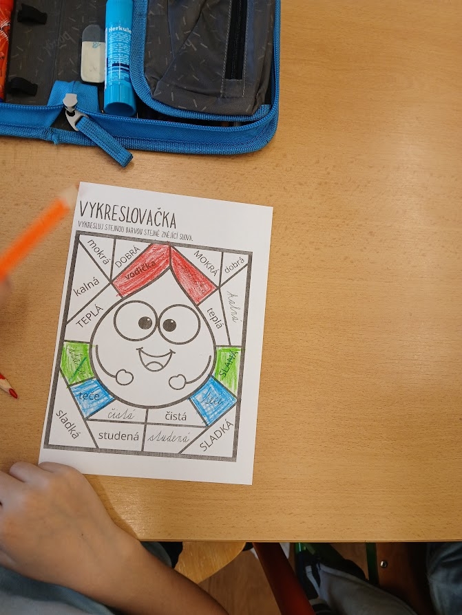 Další aktivitou bylo hledání slov se stejným významem, ale jiným tvarem písma. Děti se učily poznávat slova napsaná různými typy písma a zároveň si rozšiřovaly slovní zásobu. Dozvěděly se tak, jaká voda může být – mokrá, slaná, sladká, čistá, teplá, studená.