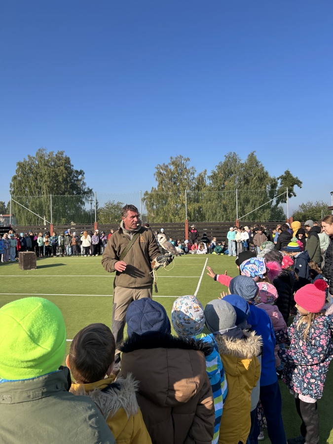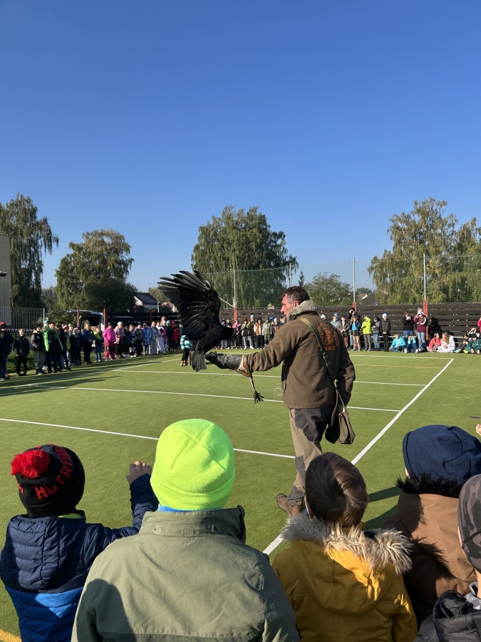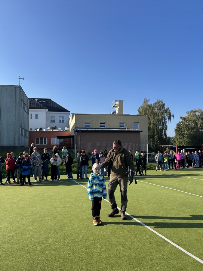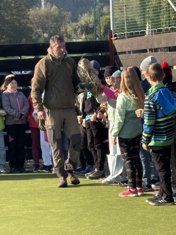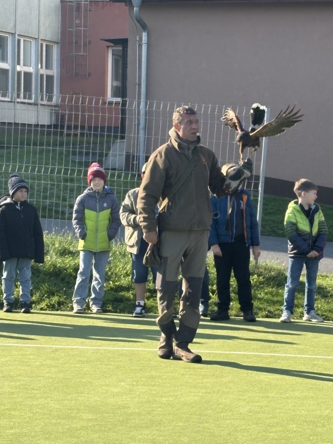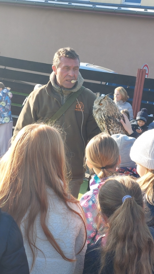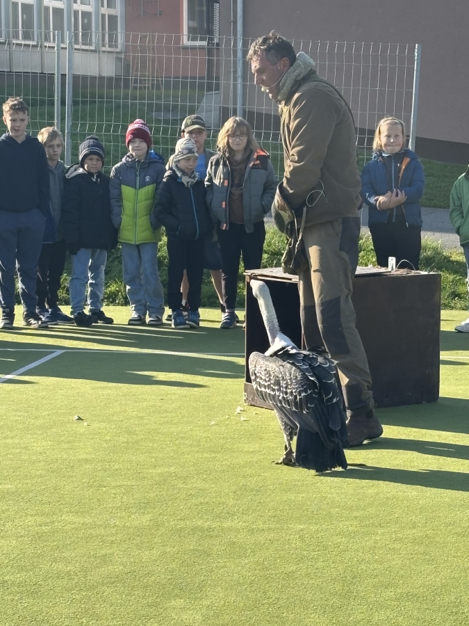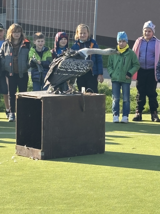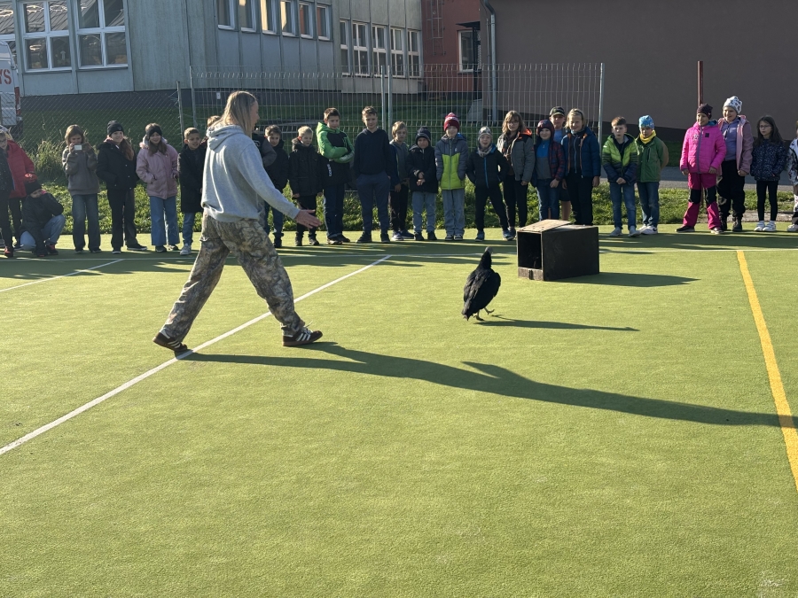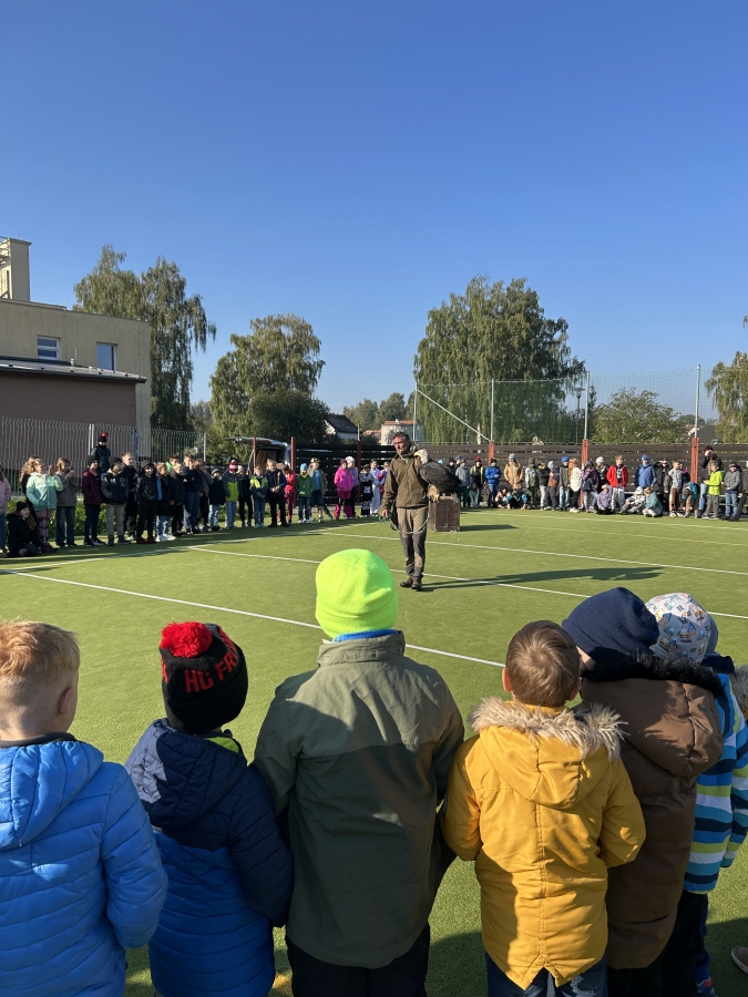 Zajímavým zpestřením byly i živé ukázky. Osmáci přivedli dva domácí mazlíčky – agamu Eddiho a králíka s velmi originálním jménem – Antonín Fenryr Šedohřbet Kousal. A to nebylo všechno – celý první i druhý stupeň si mohl užít přehlídku dravých ptáků. Děti se zblízka seznámily s orlem bělohlavým, poštolkou, supem, sokolem, sýčkem, výrem velkým i jinými dravci.
