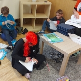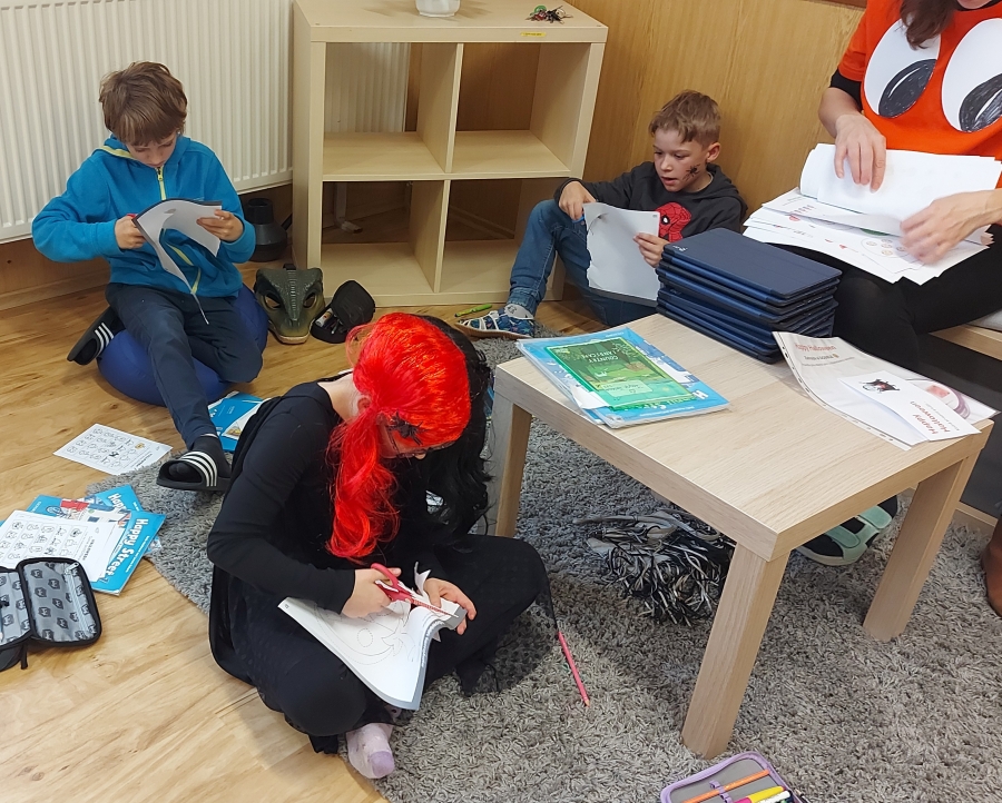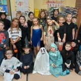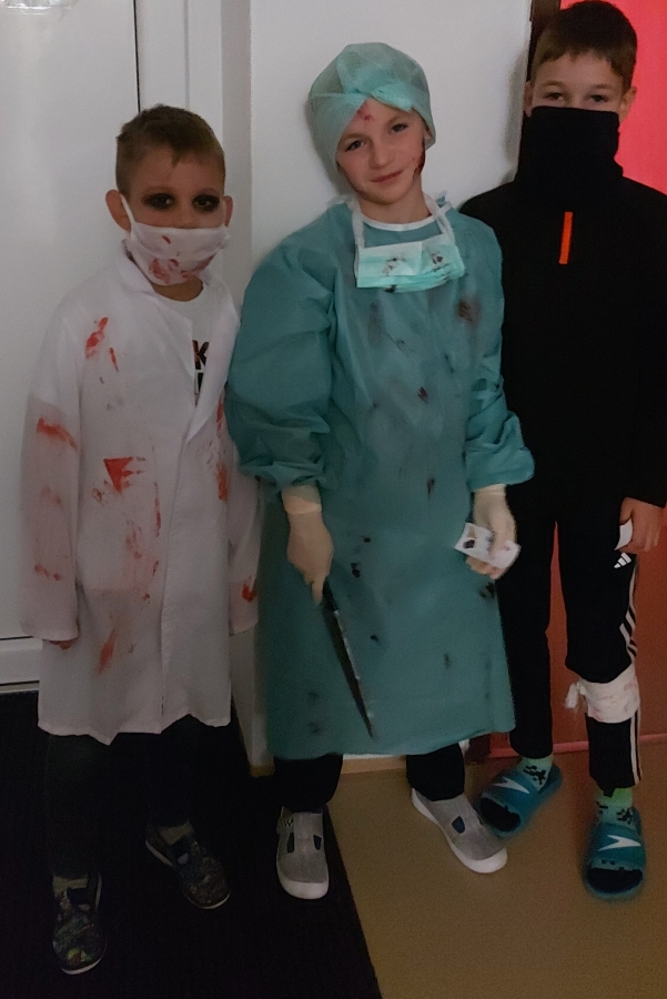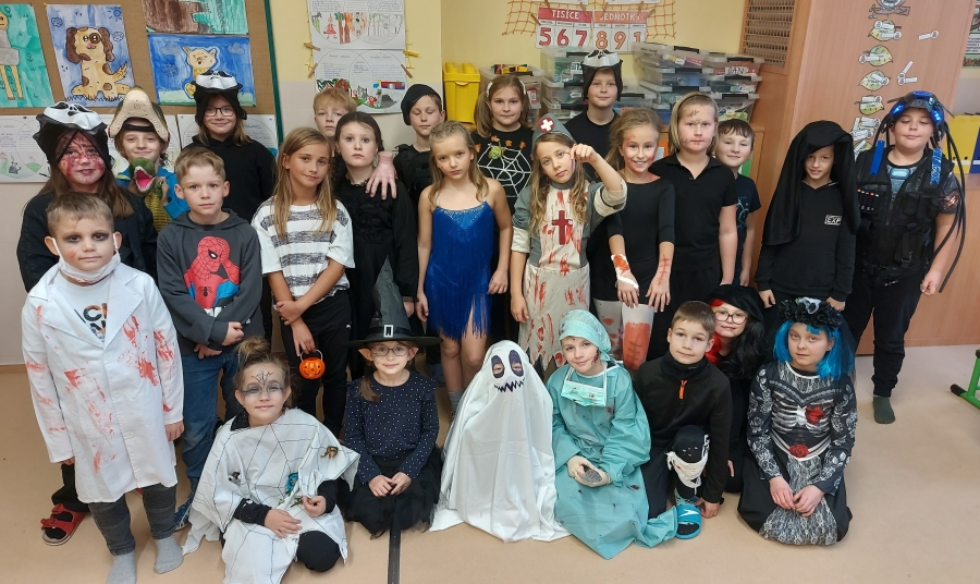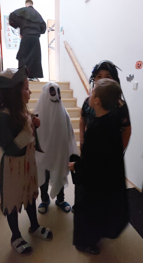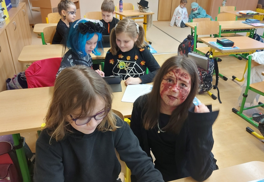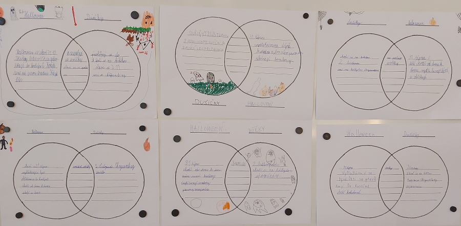 V pondělí 3.11. jsme přišli do školy v kostýmech. V matematice nás čekalo halloweenské počítání, v anglickém jazyce jsme se dozvěděli, jak slaví tento svátek v Anglii, naučili se nová slovíčka a procvičili si je při hře pexeso na tabletech. V českém jazyce jsme četli články o Dušičkách i Halloweenu a následně ve dvojicích zpracovali Vennův diagram, kde jsme se zamýšleli, co mají tyto dva svátky společného a co rozdílného. Devátá třída si pro nás připravila strašidelnou stezku, kterou jsme si moc užili. Nakonec byly oceněny nejnápaditější kostýmy. Dopoledne se nám líbilo a všem nám to velmi slušelo.