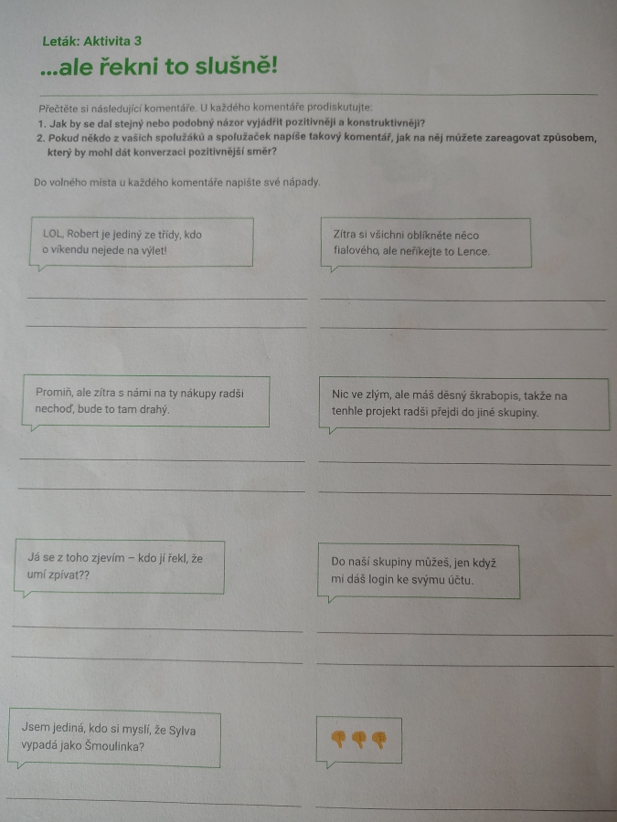 Žáci diskutovali, jak reagovat, pokud se stanou obětí nebo svědkem šikany: nereagovat na agresi, zablokovat agresora, nahlásit nevhodné chování či pomoci oběti laskavým komentářem, zprávou nebo pozváním ke společné aktivitě.