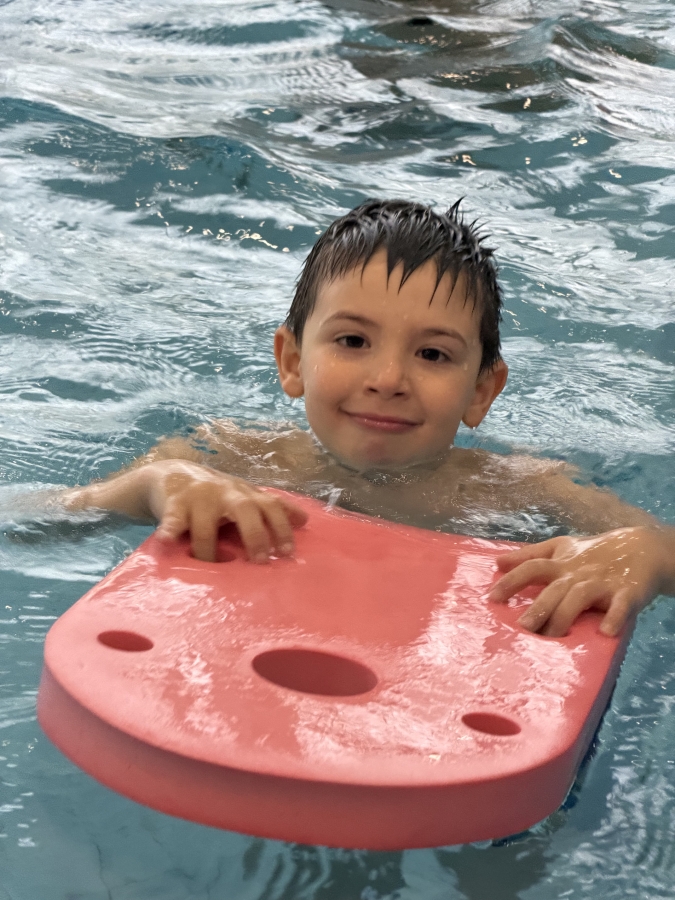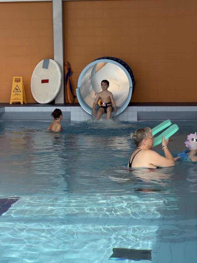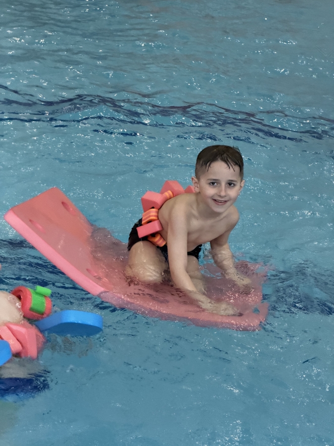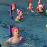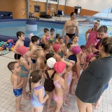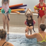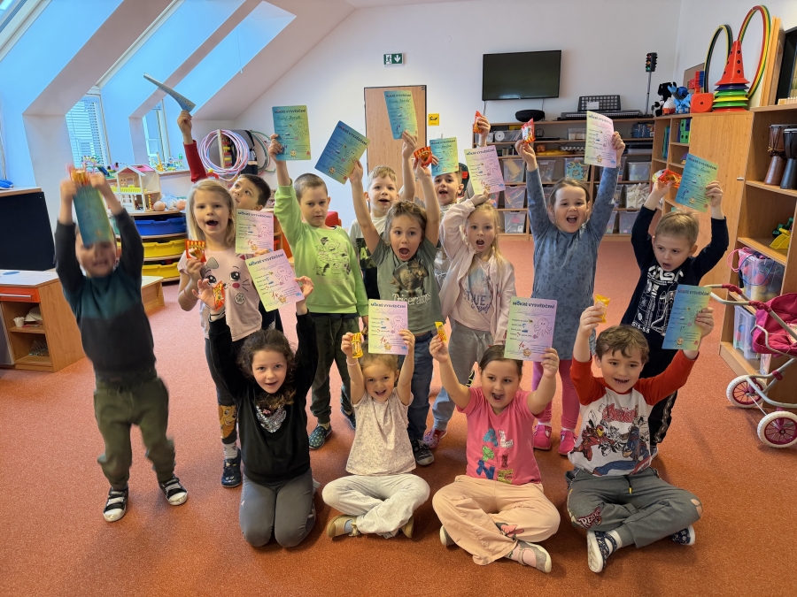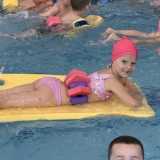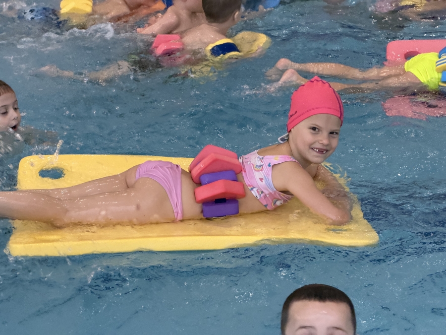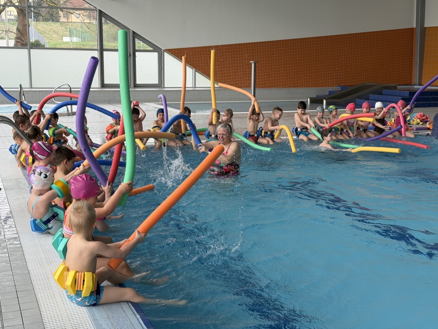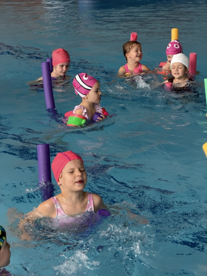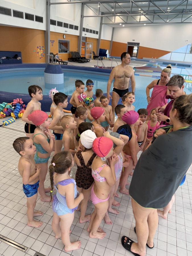 Už to tam velmi dobře známe a vše je úžasné. Od teploty vody, která je jako v moři, přes skvělé paní trenérky až po nejlepší tobogán široko daleko. Přihlásily se téměř všechny velmi odvážné a šikovné Včelky. Přidali se také Delfínci, kteří to mají, vzhledem k pojmenování své třídy :-), víceméně povinné. Strach a obavy šly téměř hned stranou u všech plaváčků. Paní trenérky nám dodaly pocit podpory a bezpečí, každý dostal svůj pás a k tomu rukávky, takže nebyla možnost se potopit, i kdybychom se o to sebevíc snažili. Každou hodinu, krůček po krůčku, tempo po tempu z nás opadával strach a my se odvažovali k dalším krokům a do hlubší vody. Plnili jsme všechny úkoly s vervou a nadšením. Od plavání s míčem, deskou či žížalou, která se samosebou ve vodě přeměnila v mořského koníka.Ti šikovnější z nás si troufli sundat postupně pás a následně i křidýlka a co víc, začali trénovat i skok do vody a šipku. Všichni na konci kurzu obstáli na výbornou a za odměnu si domů vezli mokré vysvědčení.