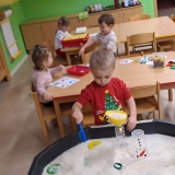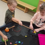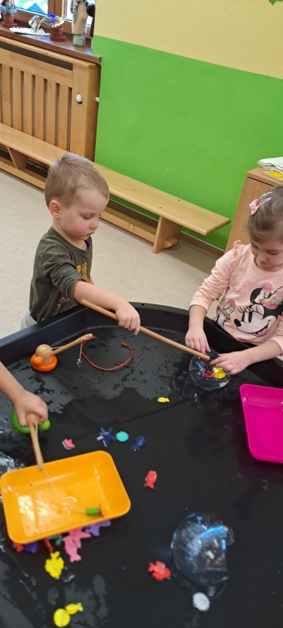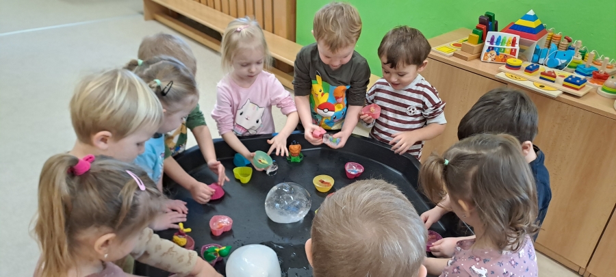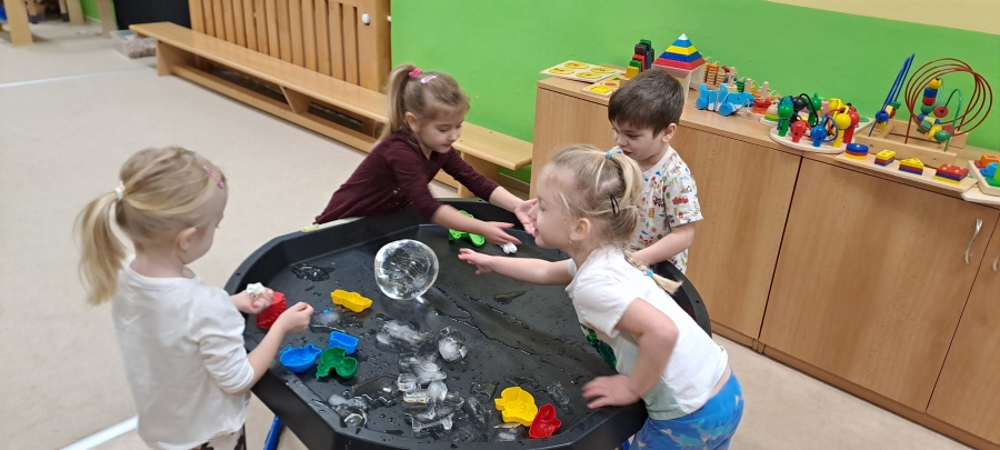 Zimní období jsme využili také k objevování vlastností vody. Pozorovali jsme vodu v tekutém i zmrzlém stavu, nechali jsme ji venku zmrznout v nafukovacích balóncích i formičkách. S ledem jsme dále experimentovali: barvili jsme ho, sypali solí, nechávali rozpouštět, lovili ryby a zkoumali, co se s ledem děje.