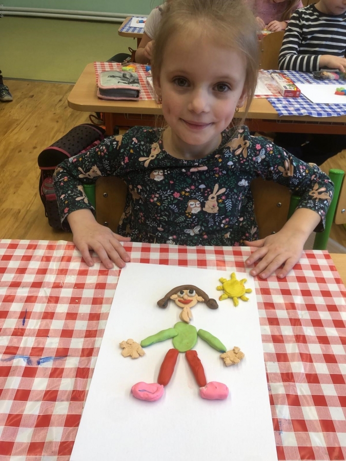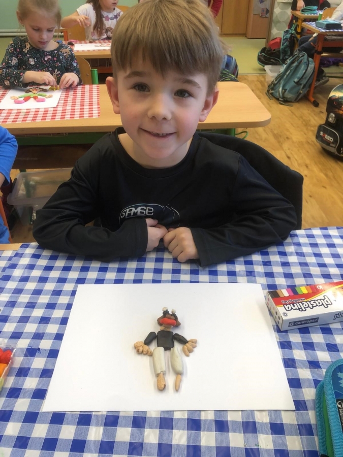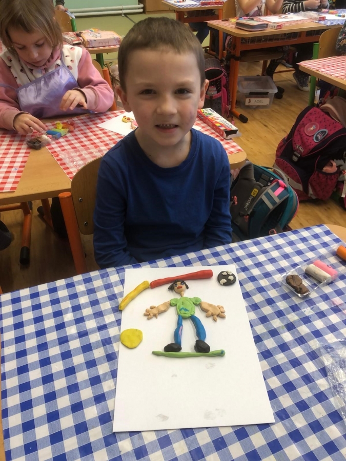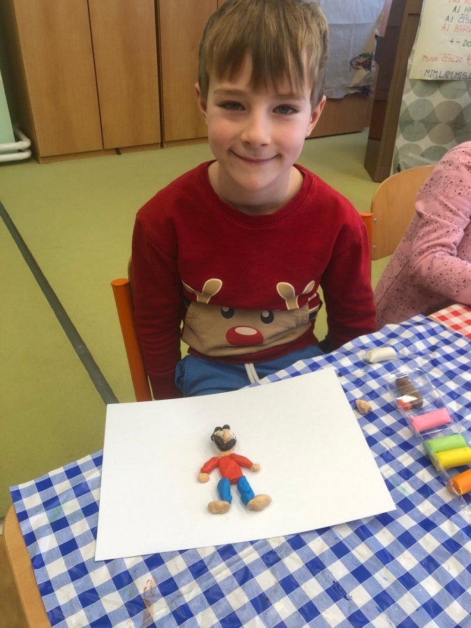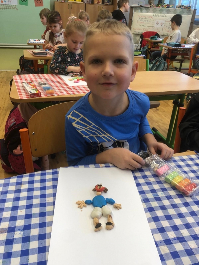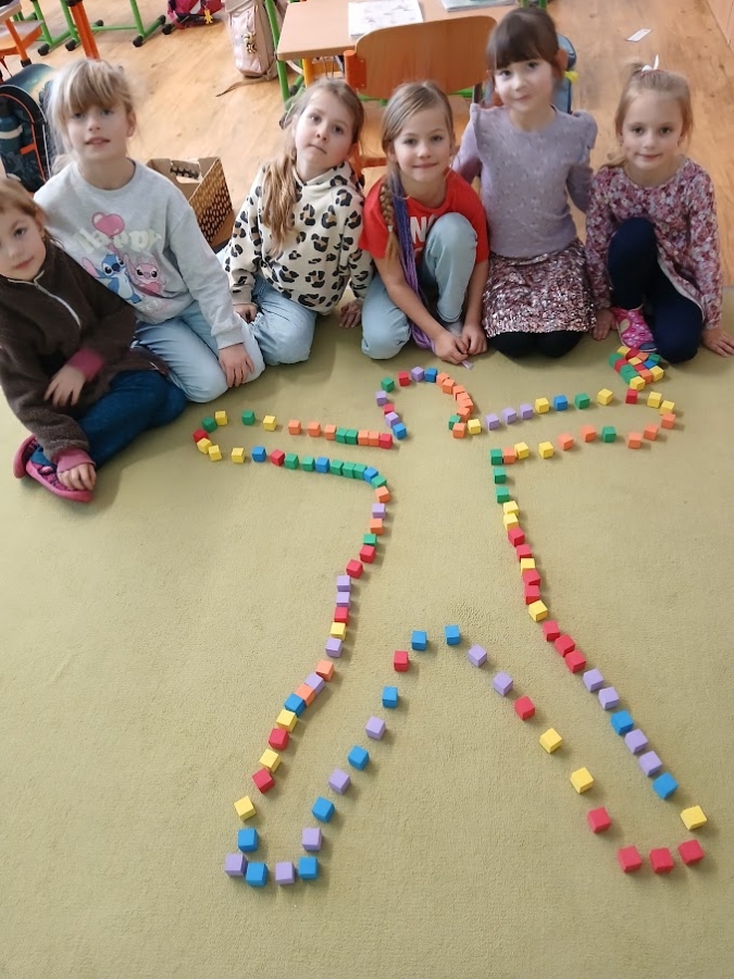 Jednou z oblíbených aktivit bylo vytváření obrysu postavy pomocí kostek. Děti pracovaly ve skupinách a pomocí kostek si znázorňovaly tvar lidského těla. Aktivita je vedla ke spolupráci, rozvíjela prostorovou představivost a zároveň jim pomohla uvědomit si základní části těla – hlavu, trup, ruce a nohy. Děti si při práci samy pojmenovávaly jednotlivé části těla. Ve výtvarné výchově si pak lidské tělo vymodelovaly.
