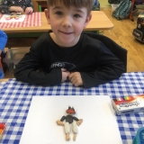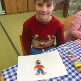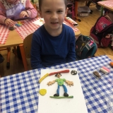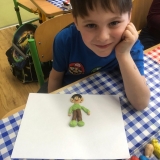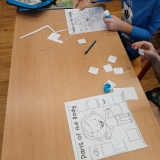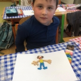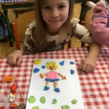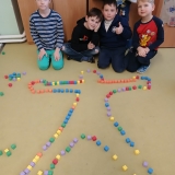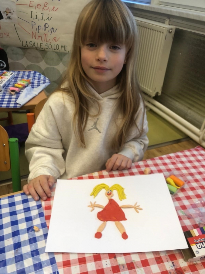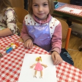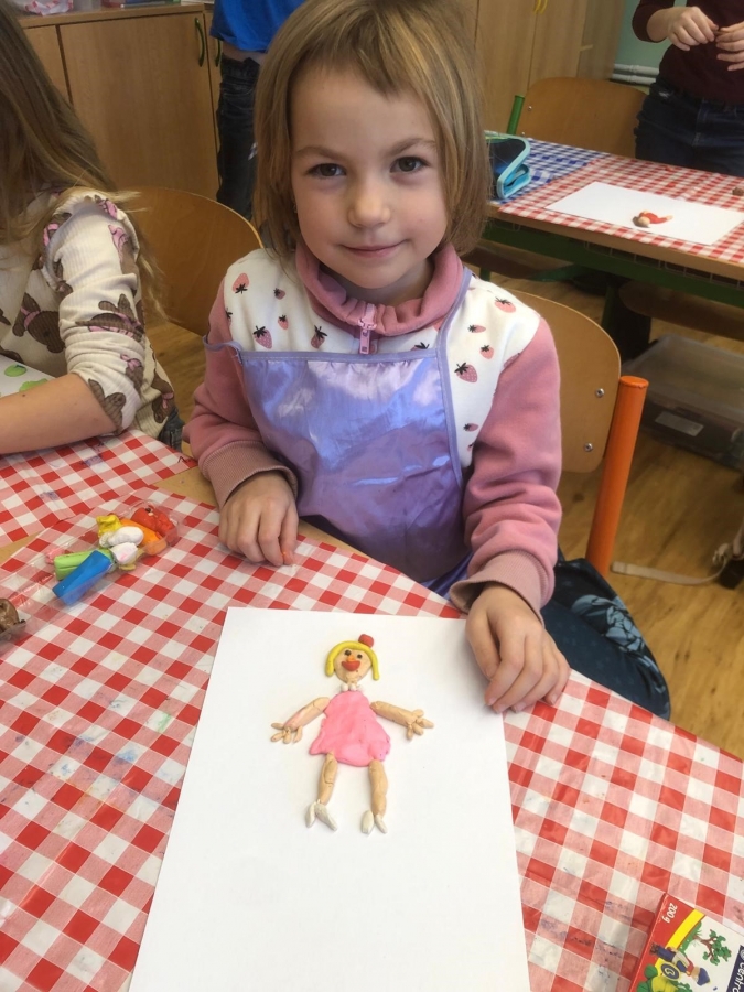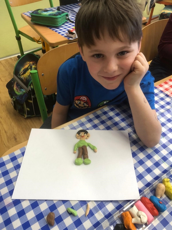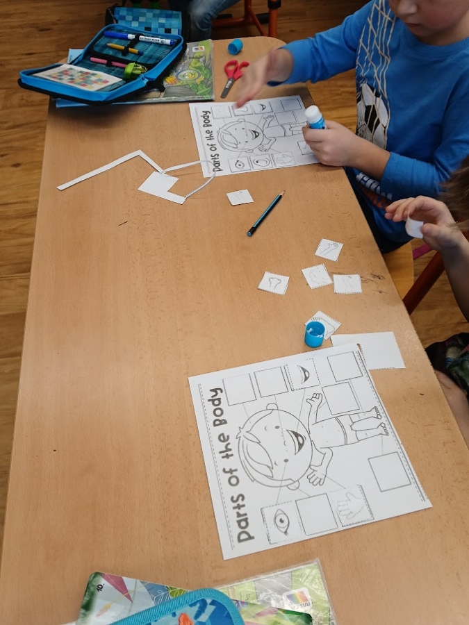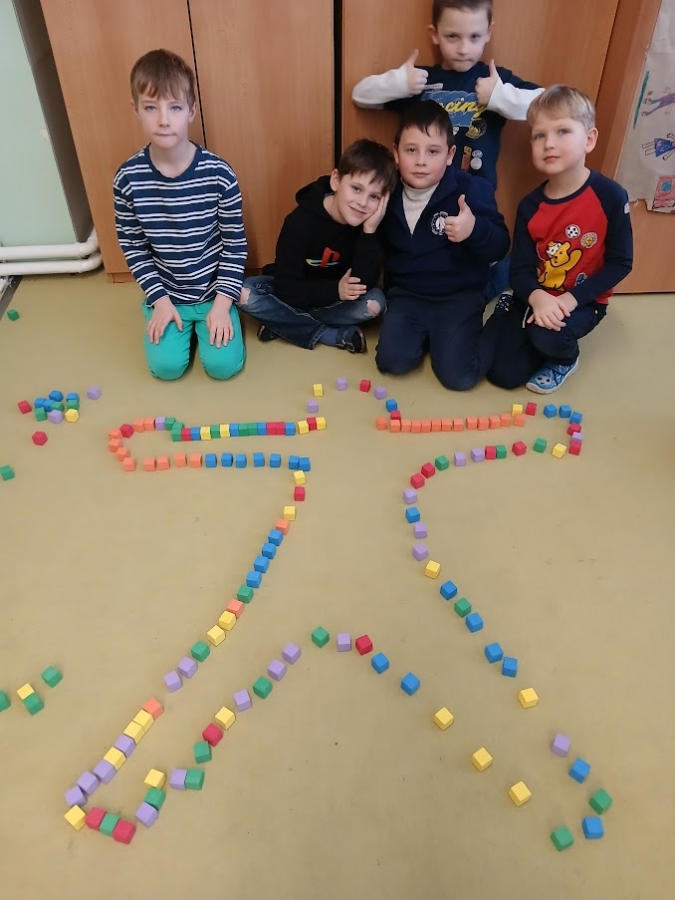 Jednou z oblíbených aktivit bylo vytváření obrysu postavy pomocí kostek. Děti pracovaly ve skupinách a pomocí kostek si znázorňovaly tvar lidského těla. Aktivita je vedla ke spolupráci, rozvíjela prostorovou představivost a zároveň jim pomohla uvědomit si základní části těla – hlavu, trup, ruce a nohy. Děti si při práci samy pojmenovávaly jednotlivé části těla. Ve výtvarné výchově si pak lidské tělo vymodelovaly.