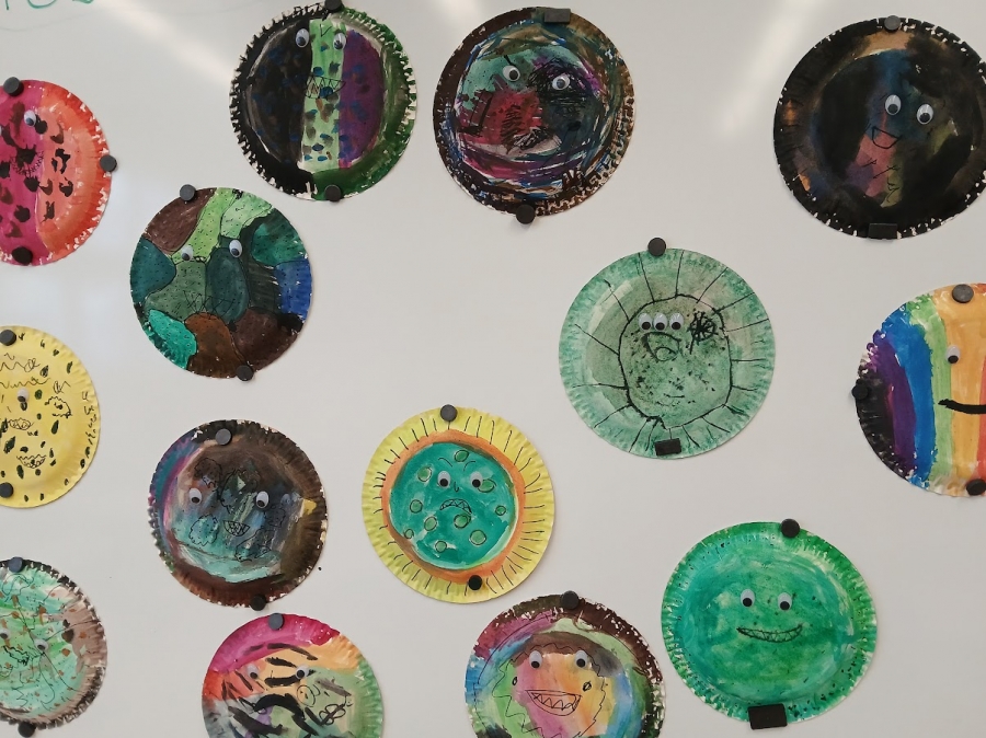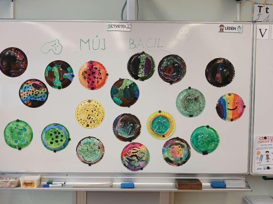 Ve výtvarné výchově jsme si představili, co všechno ohrožuje lidské tělo. Jelikož u prvňáčků řádilo spousta bacilů a byla velká nemocnost, děti si tak představily, jak může takový bacil (chřipkový, rýmový aj) vypadat.