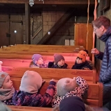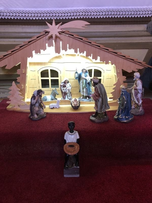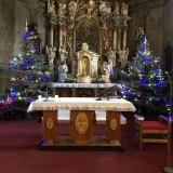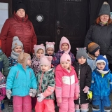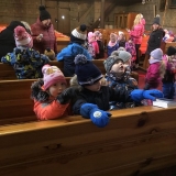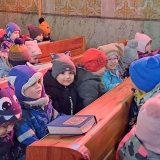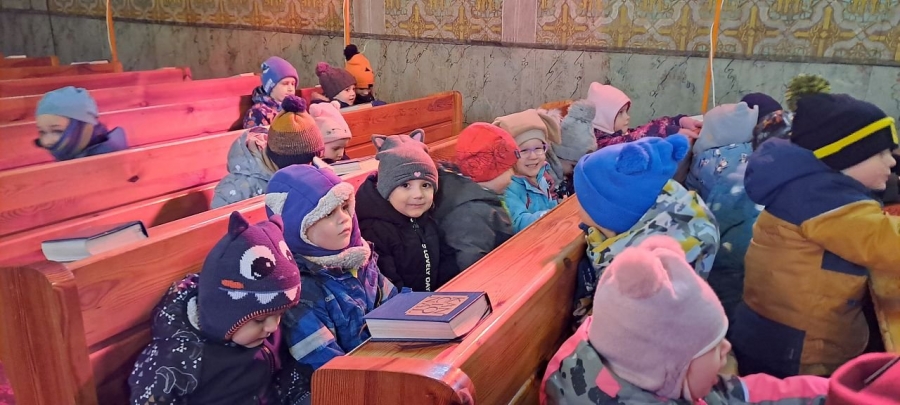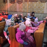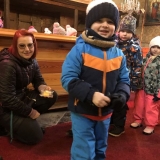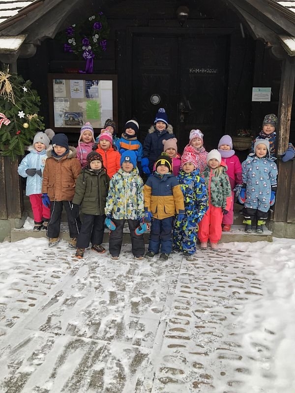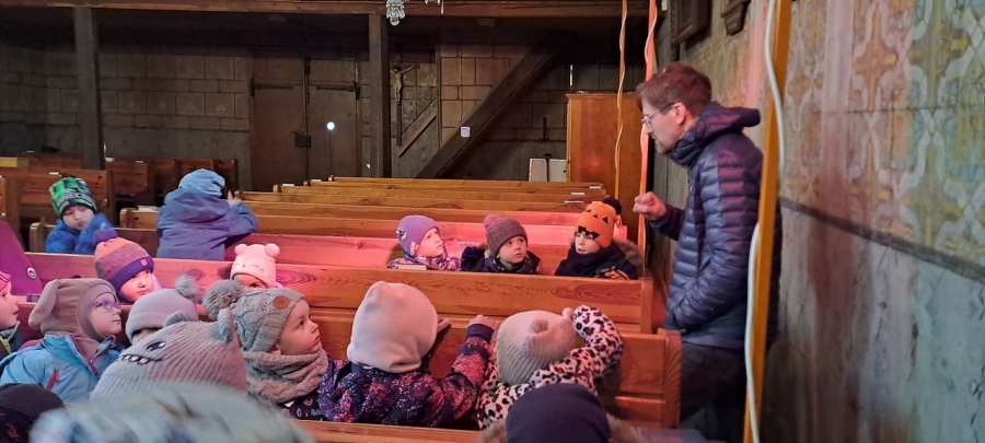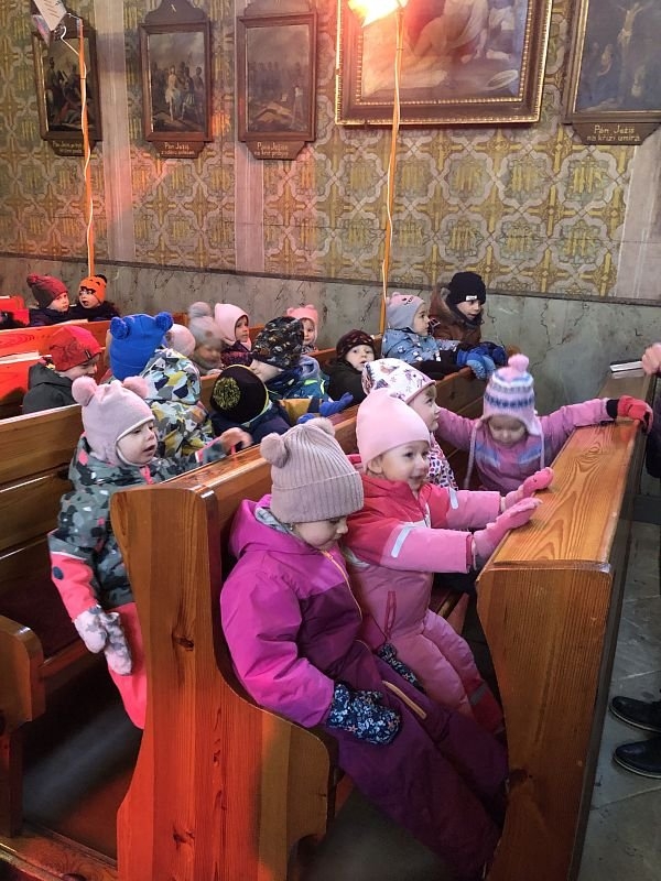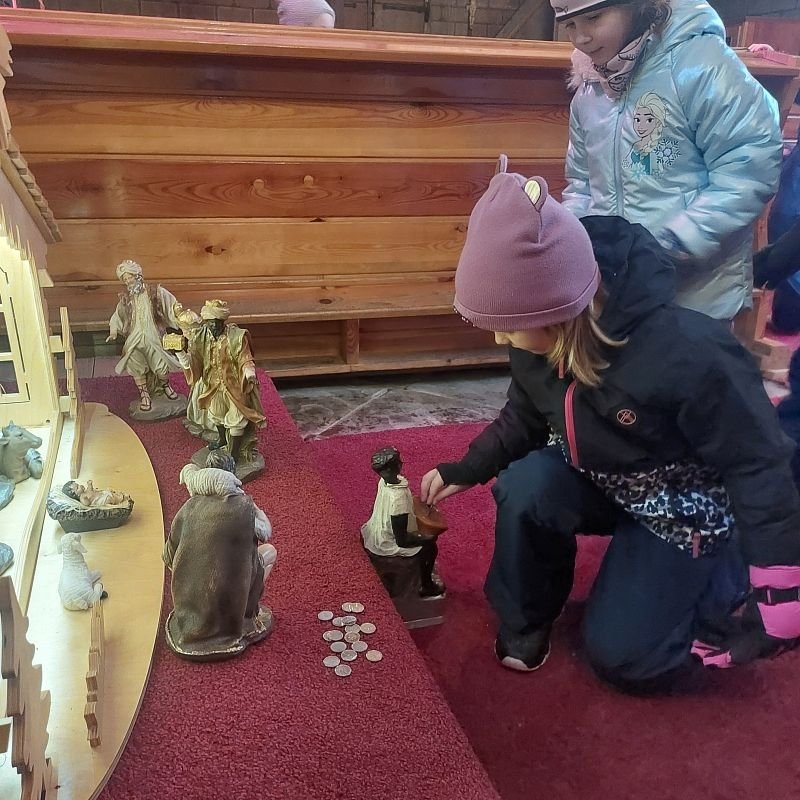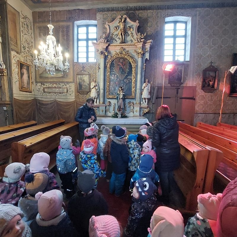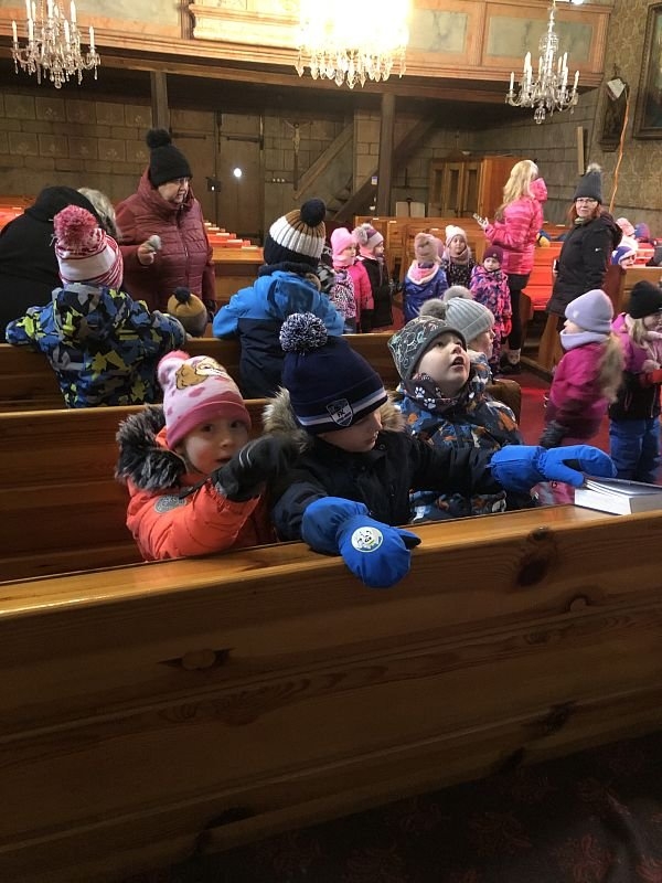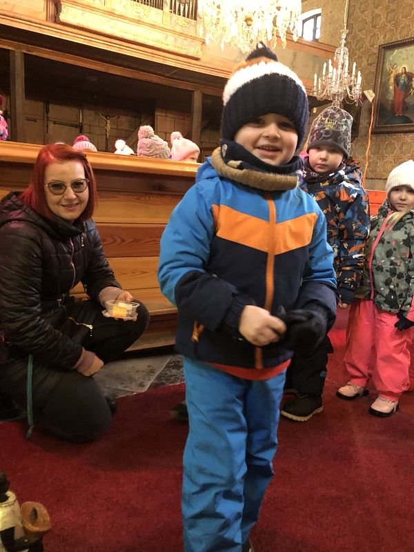 Pan farář nás přvítal před kostelem a pozval dovnitř, abychom mohli obdivovat tuto kulturní památku nejen z venku. Děti si se zájmem prohlédly betlém, u kterého jim pan farář vyprávěl příběh narození Ježíška. V betlému byly také sošky Tří králů, pan farář dětem pokládal otázky, zda znají jejich jména, co Ježíškovi nesou a proč za ním vlastně jdou. Před betlémem vždy stojí soška černouška, který děkovně kývne hlavou, když do kasičky vhodíte peníze. Každé dítě dostalo drobnou minci, kterou do kasičky vhodilo. Děti byly zvědavé na kývnutí a neuvědomovaly si, že tak přispěly na kostel a farnost.