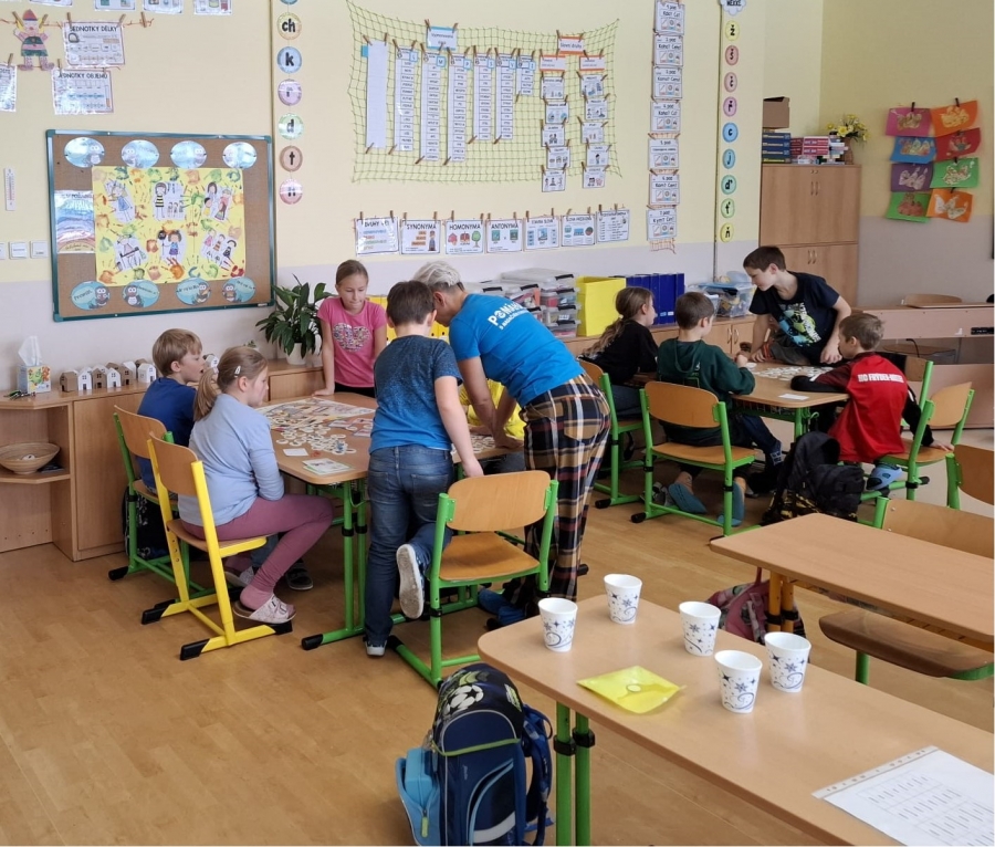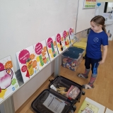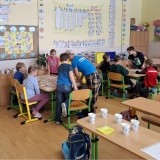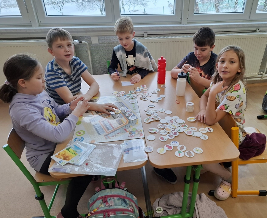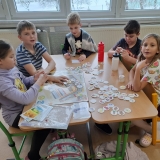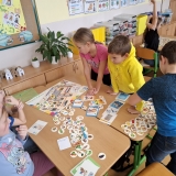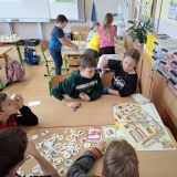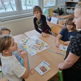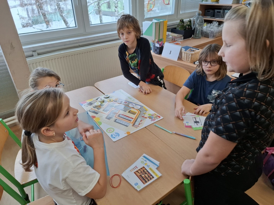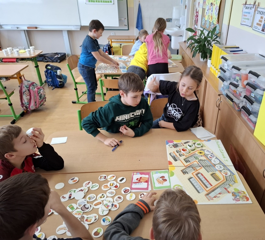 Následně jsme vytvořili čtyři týmy. Každý tým dostal plánek obchodu, nákupní košík a spoustu zboží, které postupně podle pokynů a získaných vědomostí z předešlého povídání doplňoval do svého obchodu. Úspěšné týmy dostávaly za dobře zvládnuté úkoly body. Vítězný tým byl nakonec odměněn malou pozorností.