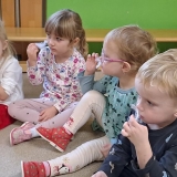 Každý den jsme začínali přivítáním básničkou, děti se učily nové písničky a říkanky s mikulášskou tematikou. Samy si také vybíraly z nabízených knih a časopisů. Pracovaly s interaktivní Albi knihou s vánočními koledami a poslouchaly krátké příběhy – například o andělském peříčku nebo čertovi, který neuměl strašit.