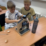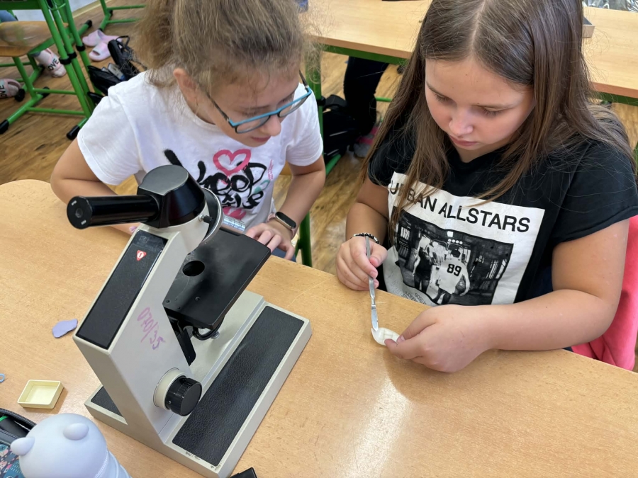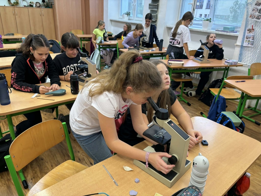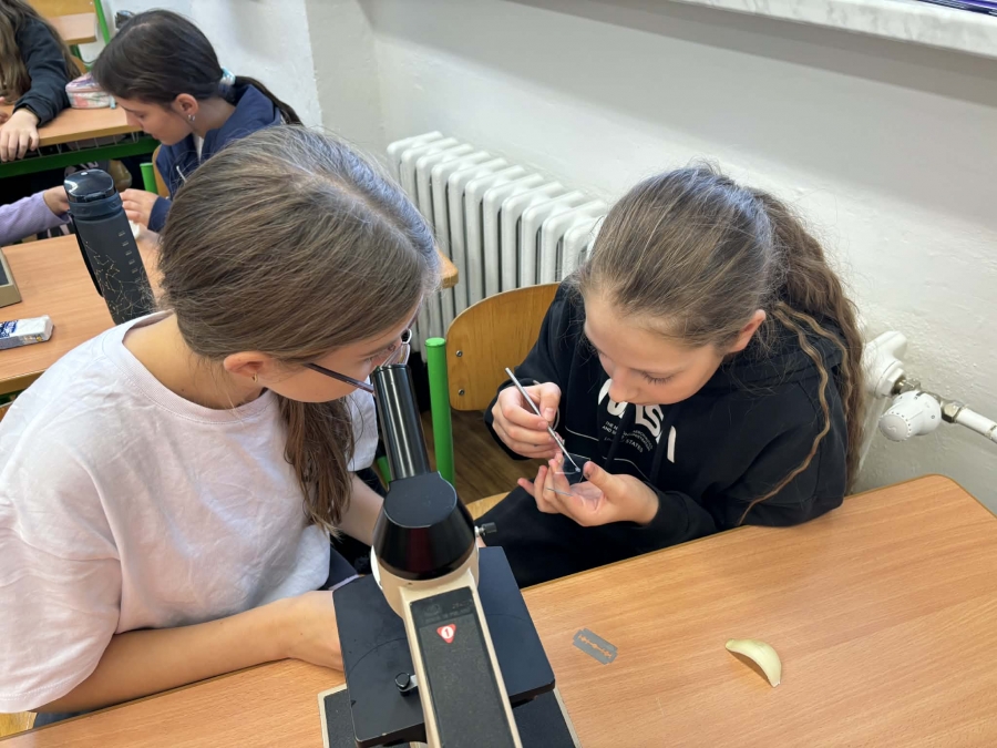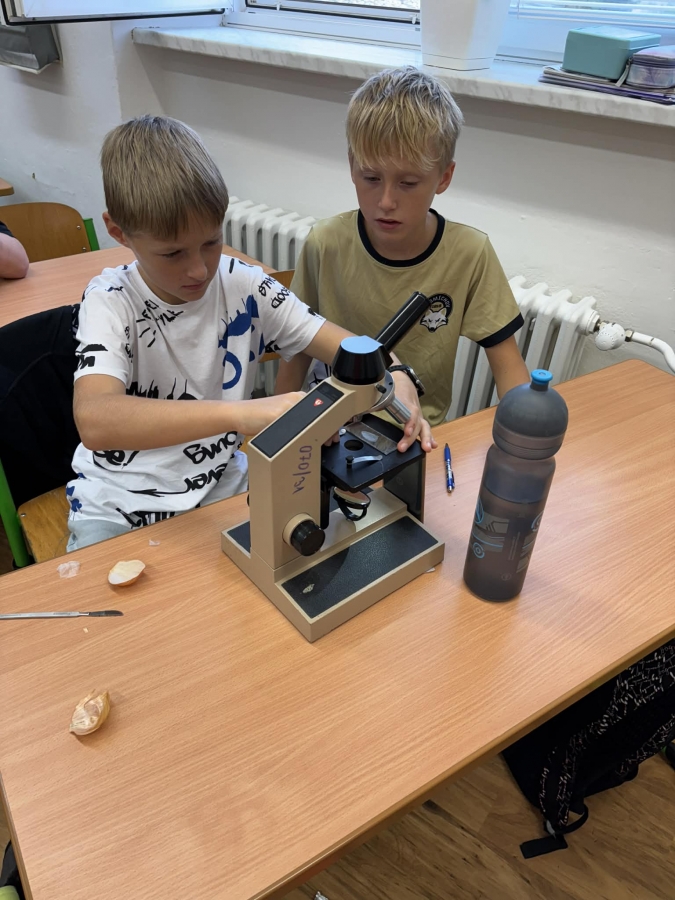 V hodině přírodopisu se žáci šesté třídy poprvé vydali do fascinujícího světa mikroskopu. Ve dvojicích si vyzkoušeli mikroskopování pokožkových buněk cibule a seznámili se se základními pravidly práce s mikroskopem.