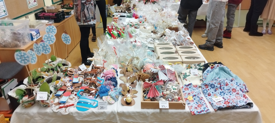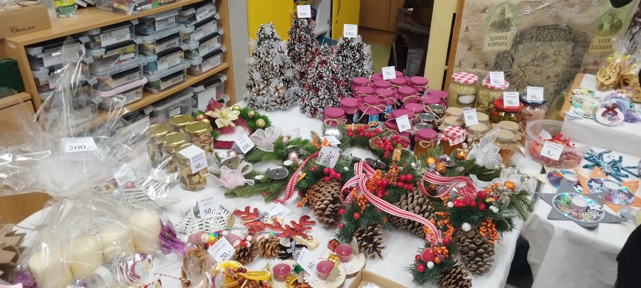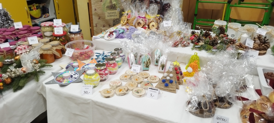 Ve školce jsme s dětmi vyráběli hlavně dekorace pro vánoční období. Největším hitem ze Sluníček se staly sušené jablkové křížalky. Děti pečlivě krájely, sušily a průběžnou ochutnávkou kontrolovaly kvalitu výrobního procesu. Užily si i loupání ořechů na svíčkové lodičky, které zaručeně doplují k cíli. Velký úspěch měly i ručně vyráběné svícny a šiškové stromky Včelek, lákaví sladcí sobíci a adventní kalendáře Delfínků a mnoho dalších výrobků našich nejmladších.