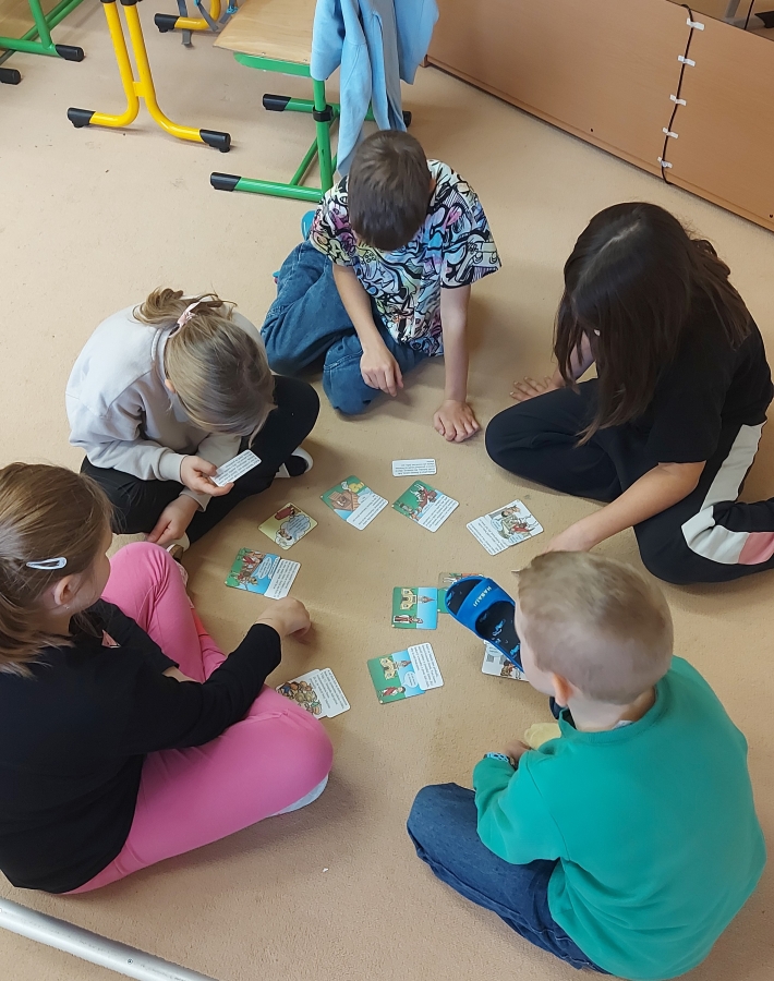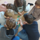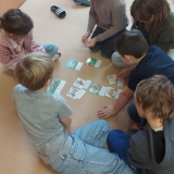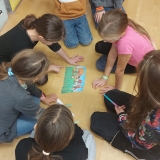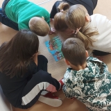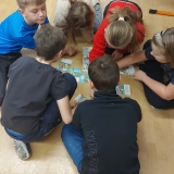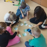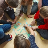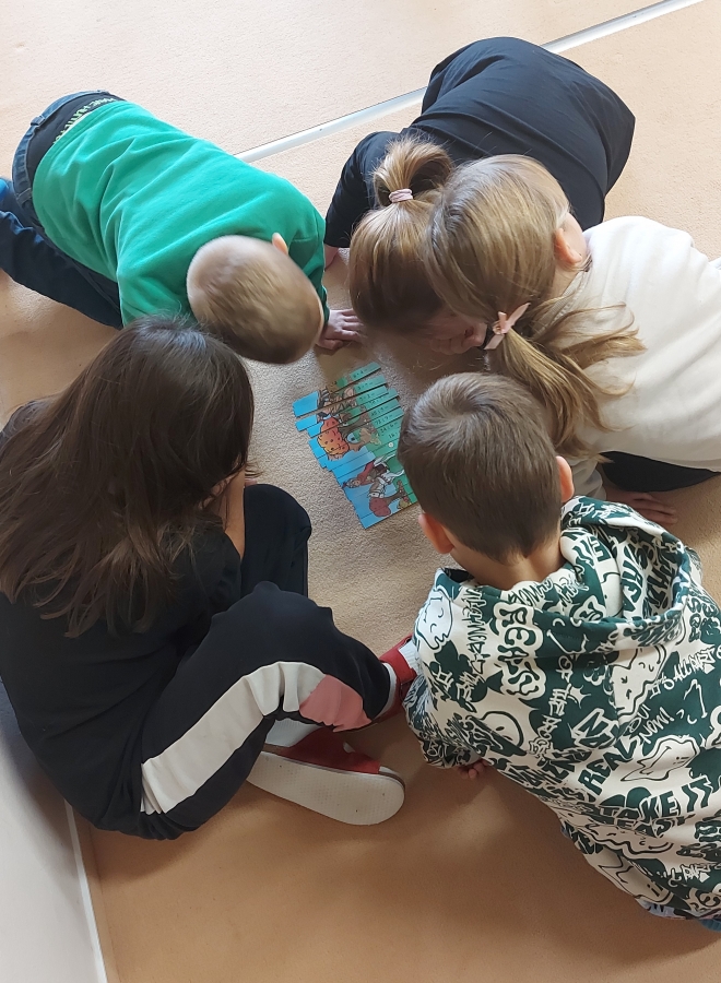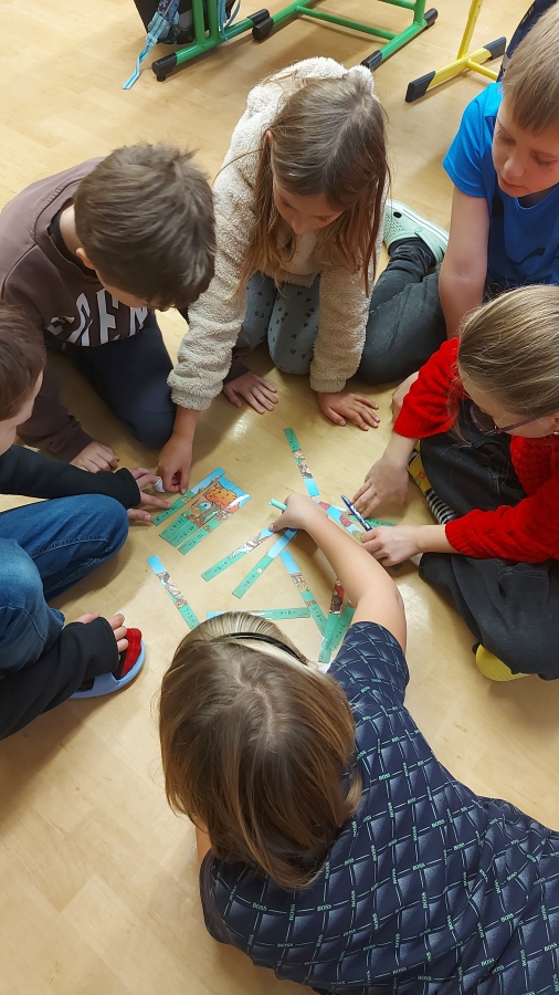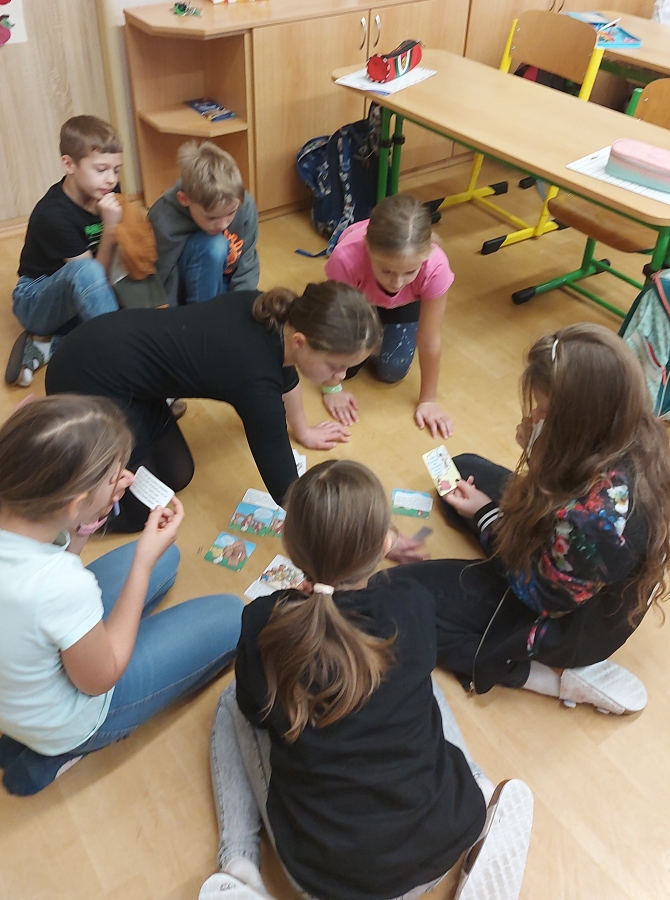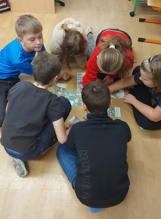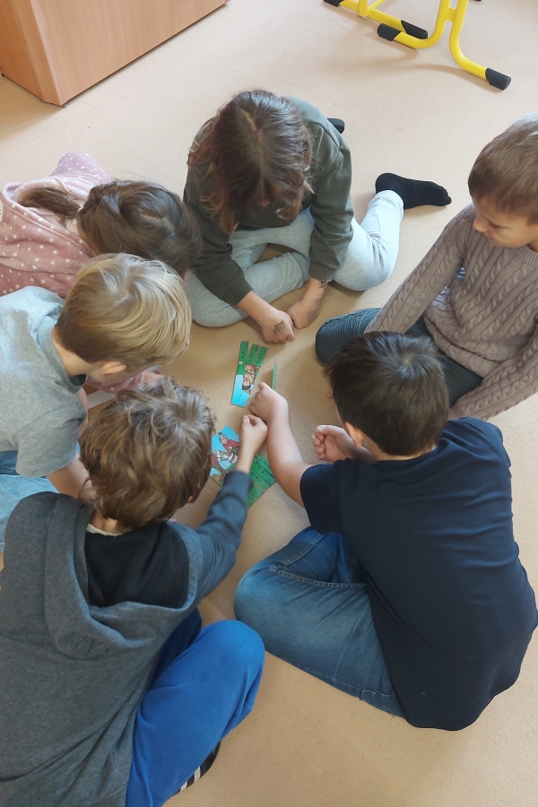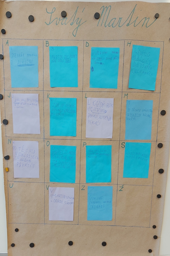 Dne 11. listopadu jsme úterní výuku věnovali sv. Martinovi. Rozdělili jsme se do skupin. Každá skupina dostala obrázky a texty. Úkolem bylo sestavit obrázkový příběh o životě sv. Martina a ke každému obrázku přiřadit správnou část textu. Při této činnosti jsme si procvičili řazení podle časové posloupnosti a čtení s porozuměním. Druhý úkol byl matematický. Skupiny dostaly proužky s příklady malé násobilky a částmi obrázku. Při správném počítání se nám z proužků skládal obrázek, na kterém se sv. Martin dělí o svůj plášť s žebrákem. Následovala čtenářská lekce, kde jsme pracovali s textem a poté metodou Alfabox shrnuli všechny své vědomosti týkající se sv. Martina pod daná písmena abecedy.