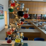 V 3. laboratorní práci se žáci 8. třídy věnovali praktickému tématu - přípravě roztoků s přesnou koncentrací. Úkolem žáků bylo vypočítat hmotnost směsi tak, aby připravili několikaprocentní roztok. Bez správných matematických výpočtů se tentokrát neobešli. Každá dvojice pracovala s jinou směsí složenou z cukru nebo soli a potravinářského barviva. Díky použití různých barviv vzniklo ve třídě spoustu odlišně zbarvených roztoků. Všichni si tak procvičili chemické výpočty a laboratorní dovednosti a na závěr hodiny si z připravených barevných roztoků vytvořili chemický vánoční stromek.