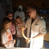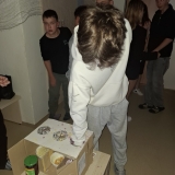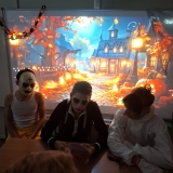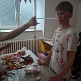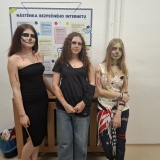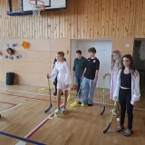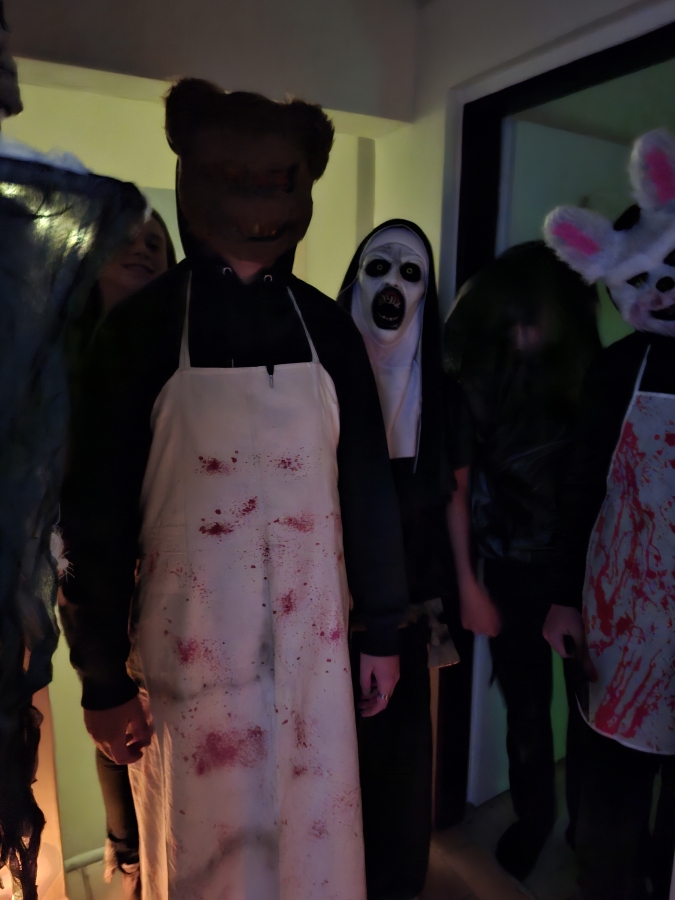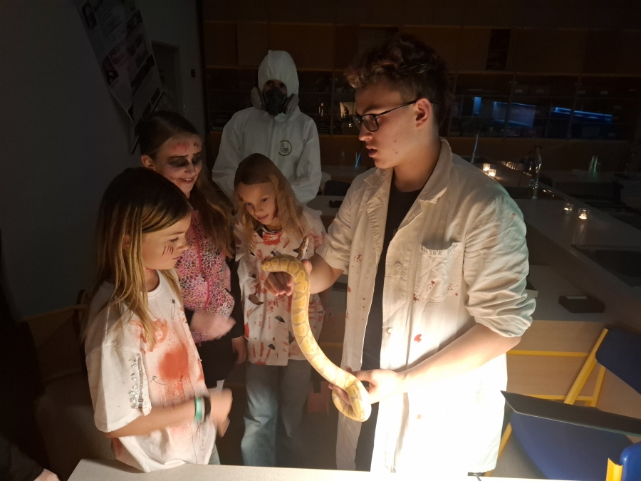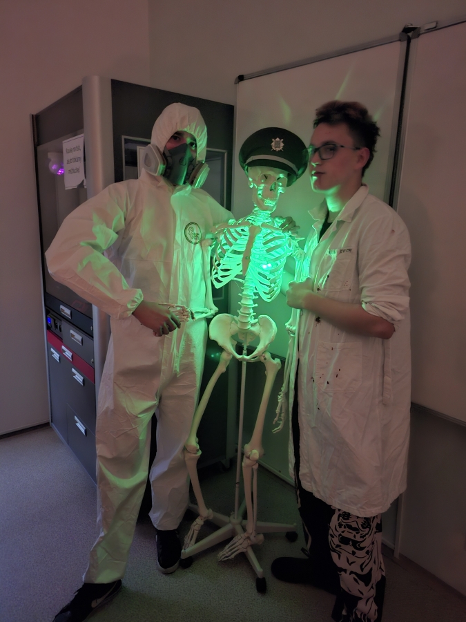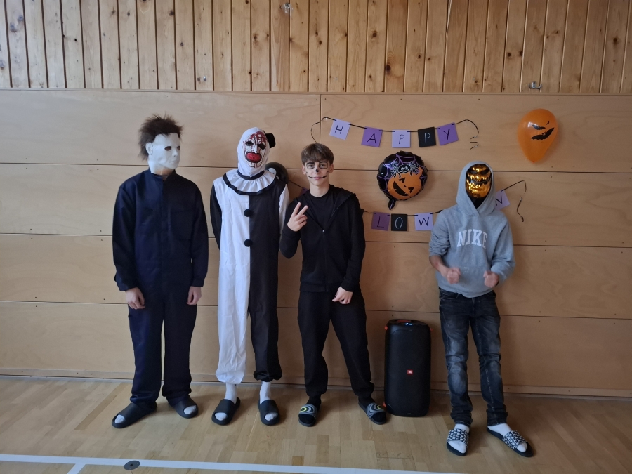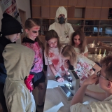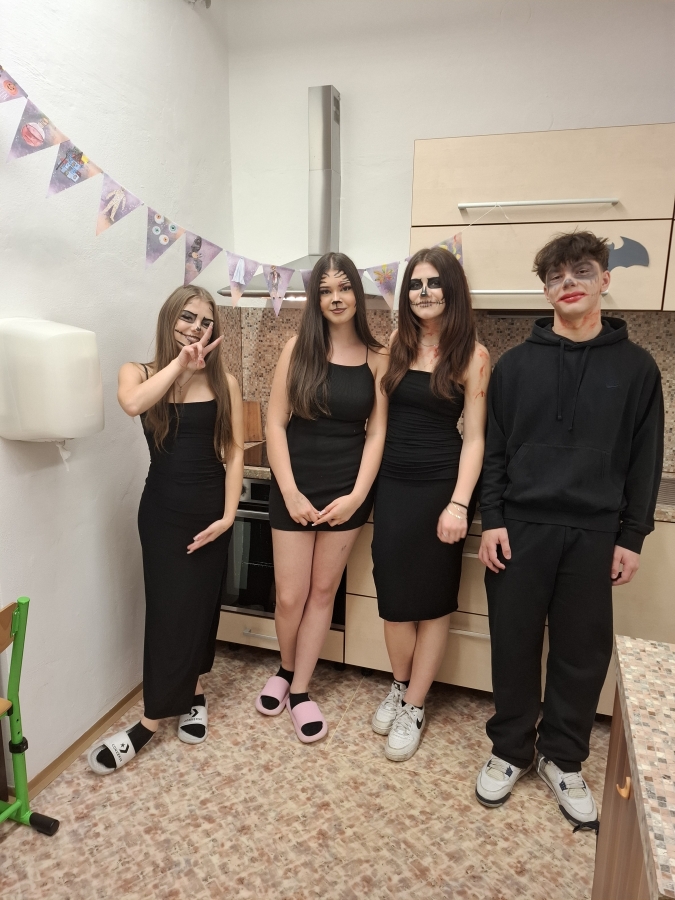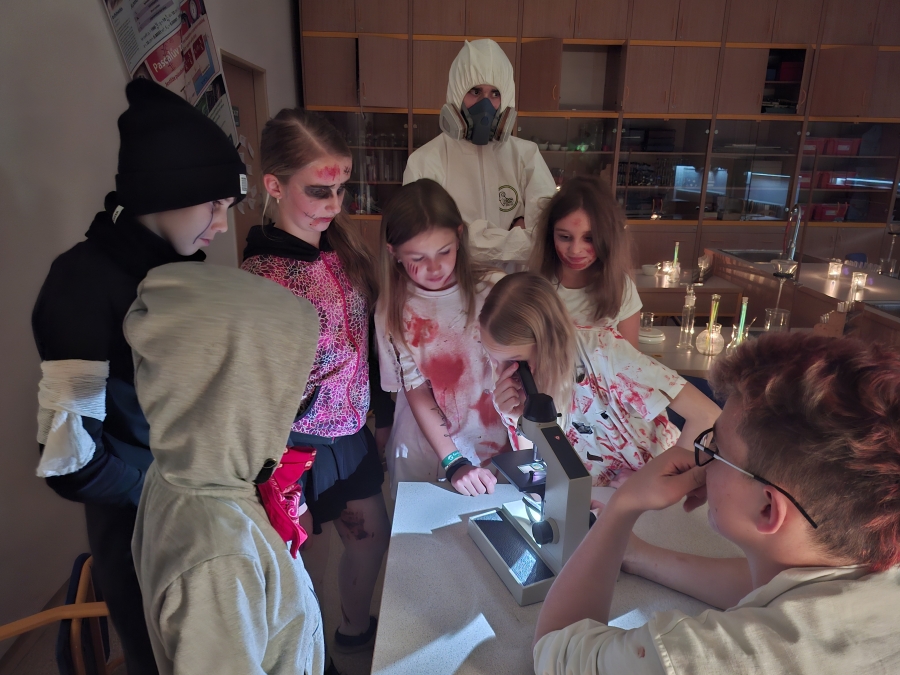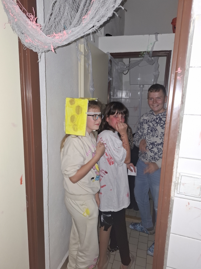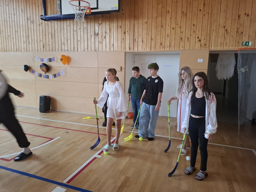Deváťáci si pro mladší spolužáky připravili halloweenský program v podobě strašidelné stezky se sedmi stanovišti. Týmy žáků zde plnily nejrůznější úkoly – od překážkové dráhy odvahy, přes ochutnávání záhadných chutí (hruška s hořčicí měla velký úspěch!), až po poznávání materiálů poslepu nebo hledání halloweenských tajenek. Na každém stanovišti sbírali indicie v podobě písmen, z nichž museli na závěr složit tajné slovo. Většina týmů stezku úspěšně dokončila a všichni si odnesli diplom za statečnost.