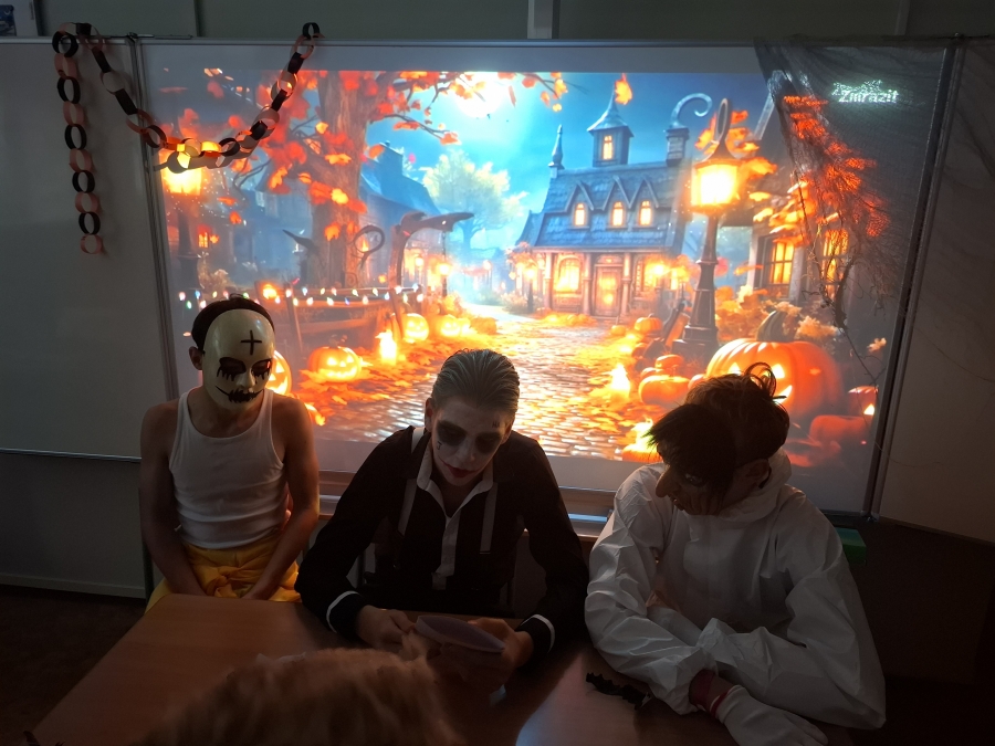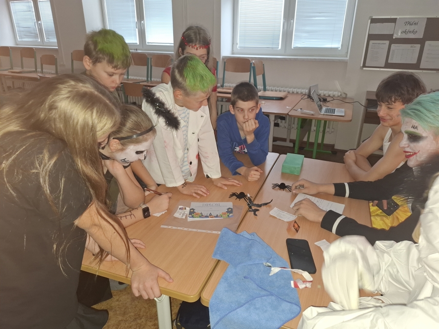 Ani učitelé nezůstali pozadu – připravili si tematicky laděnou výuku. Žáci pracovali s halloweenskými pracovními listy, tvořili koláže na tabletech a v hodinách českého jazyka procvičovali čtení s porozuměním na strašidelných textech.