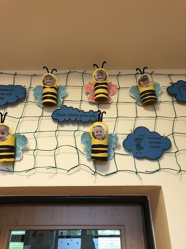 Ve třídě nás přivítala háčkovaná včelka, která je třídním maskotem a bude naší kamarádkou při různých aktivitách. A protože jsme třída Včeliček, máme také svého patrona, kterým nemůže být nikdo jiný než skřítek Medovníček. Tento skřítek nás bude provázet celým školním rokem a každý měsíc nám přinese nové téma k prozkoumávání.